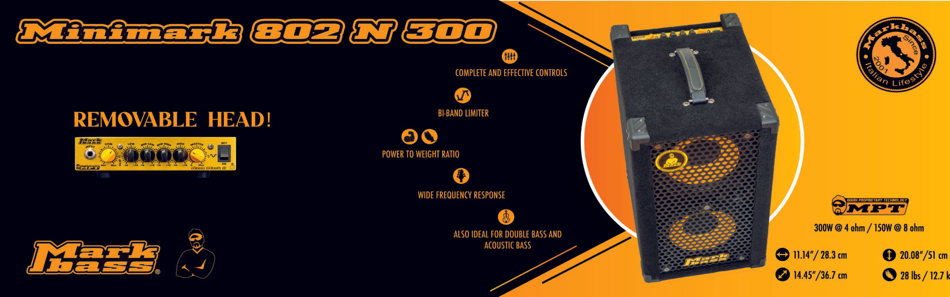 The Minimark 802 N300 weighing only 28 lbs / 12.7 kg and has an unbelievable power-to-weight ratio and the rich and warm tones unique to Markbass. It cranks out 150W of power on its own (300W when used with an extension cab) and its full range - with plenty of bottom end - is unrivalled.